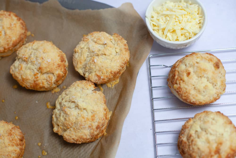 A delicious alternative to plain or fruit scones, these treats are served with butter. Cheese scones are also delicious as a side with soup or stew.